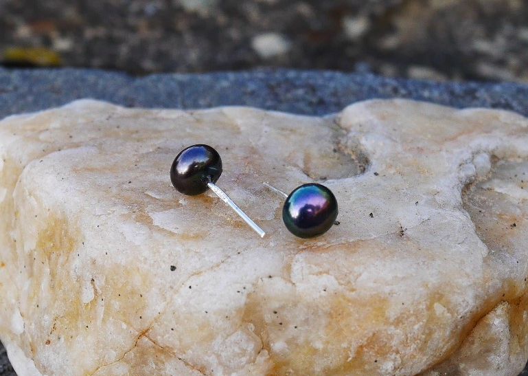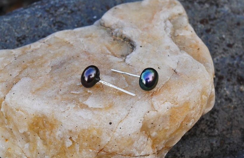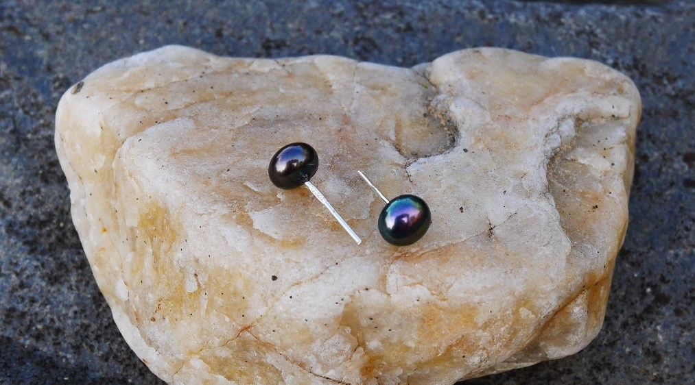 Stříbrné náušnice styl puzeta s dokonale lesklými říčními perlami typu button o průměru cca 6 mm v tmavě modré barvě s duhovými perleťovými odlesky.