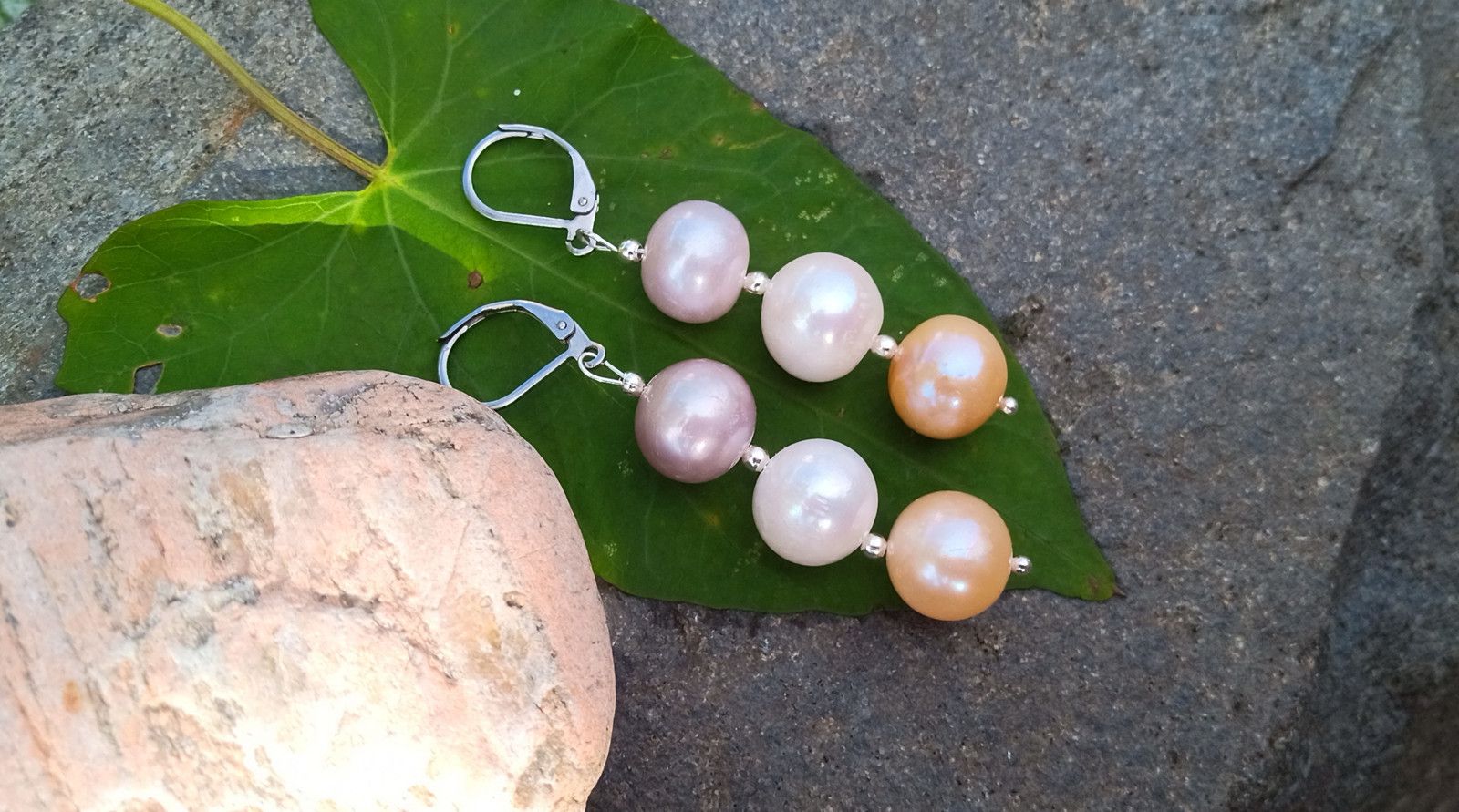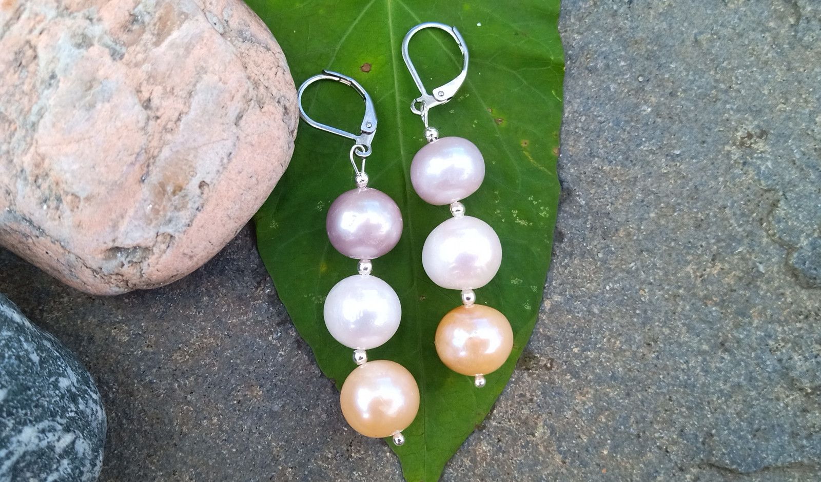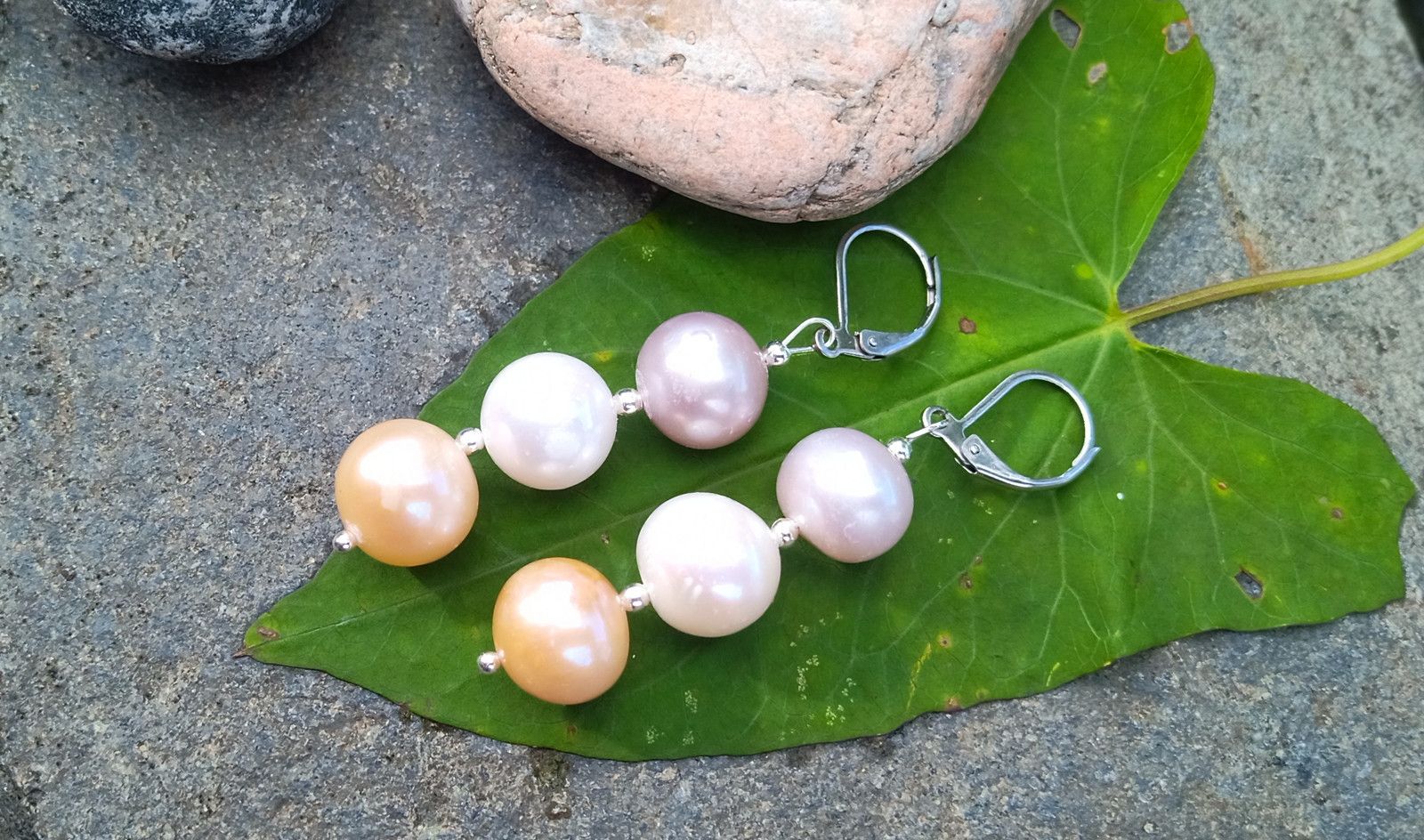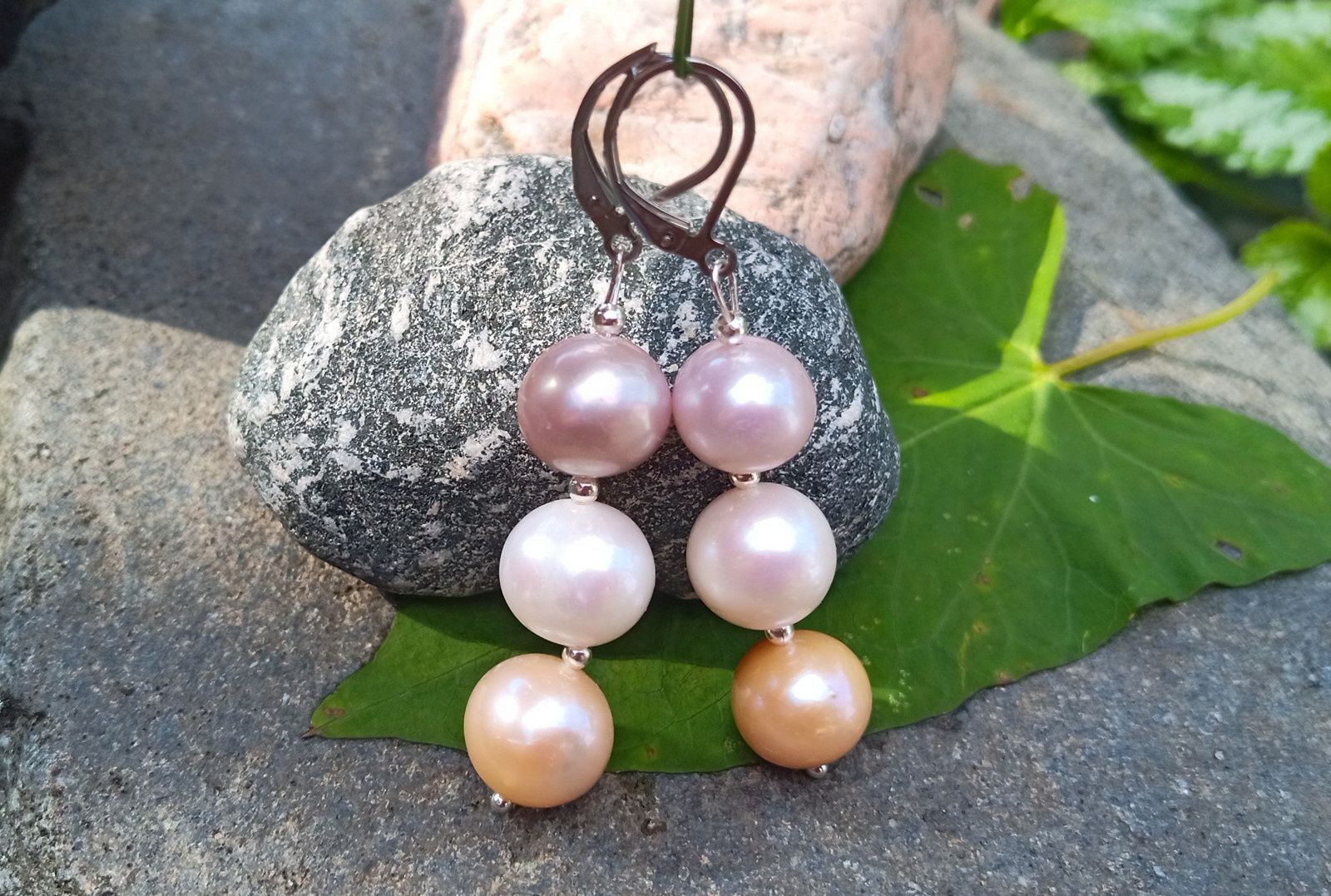 Dokonale lesklé mořské perly o průměru cca 12 mm v bílé, fialkové a meruňkové barvě vzájemně oddělené drobným stříbrným korálkem na zavíracích háčcích z chirurgické oceli - hypoalergenní, vhodné i pro alergiky.