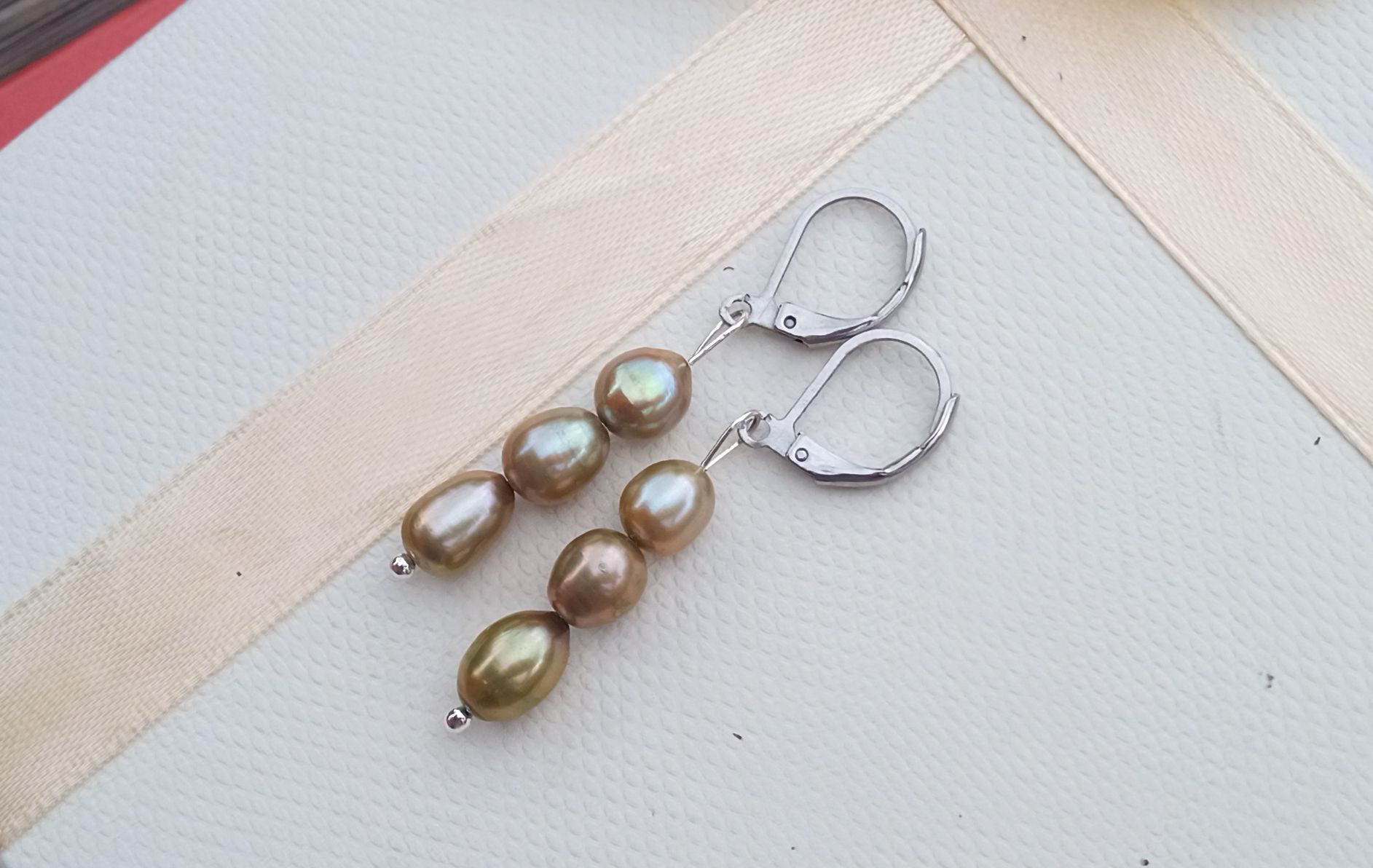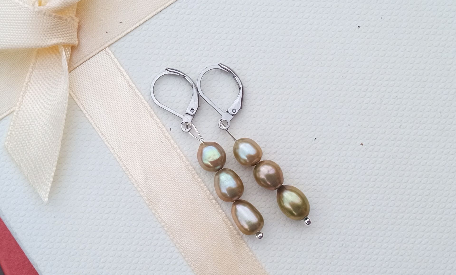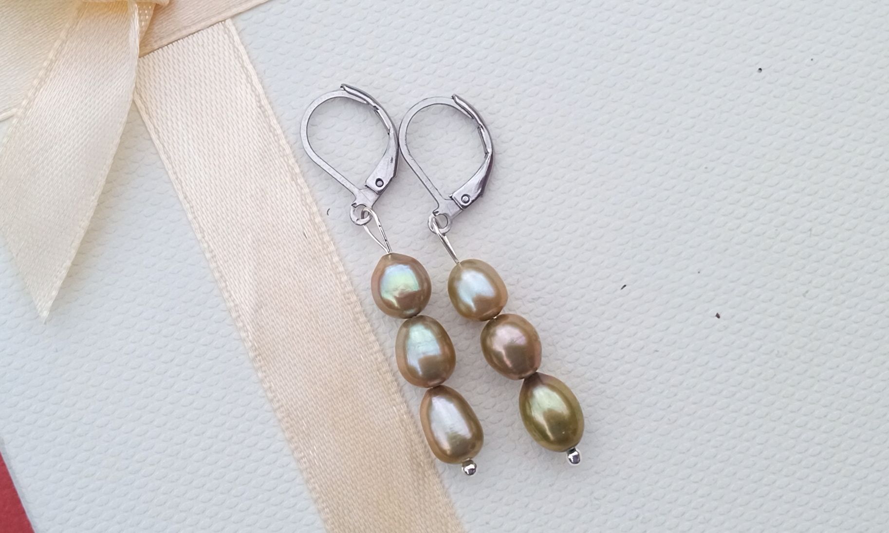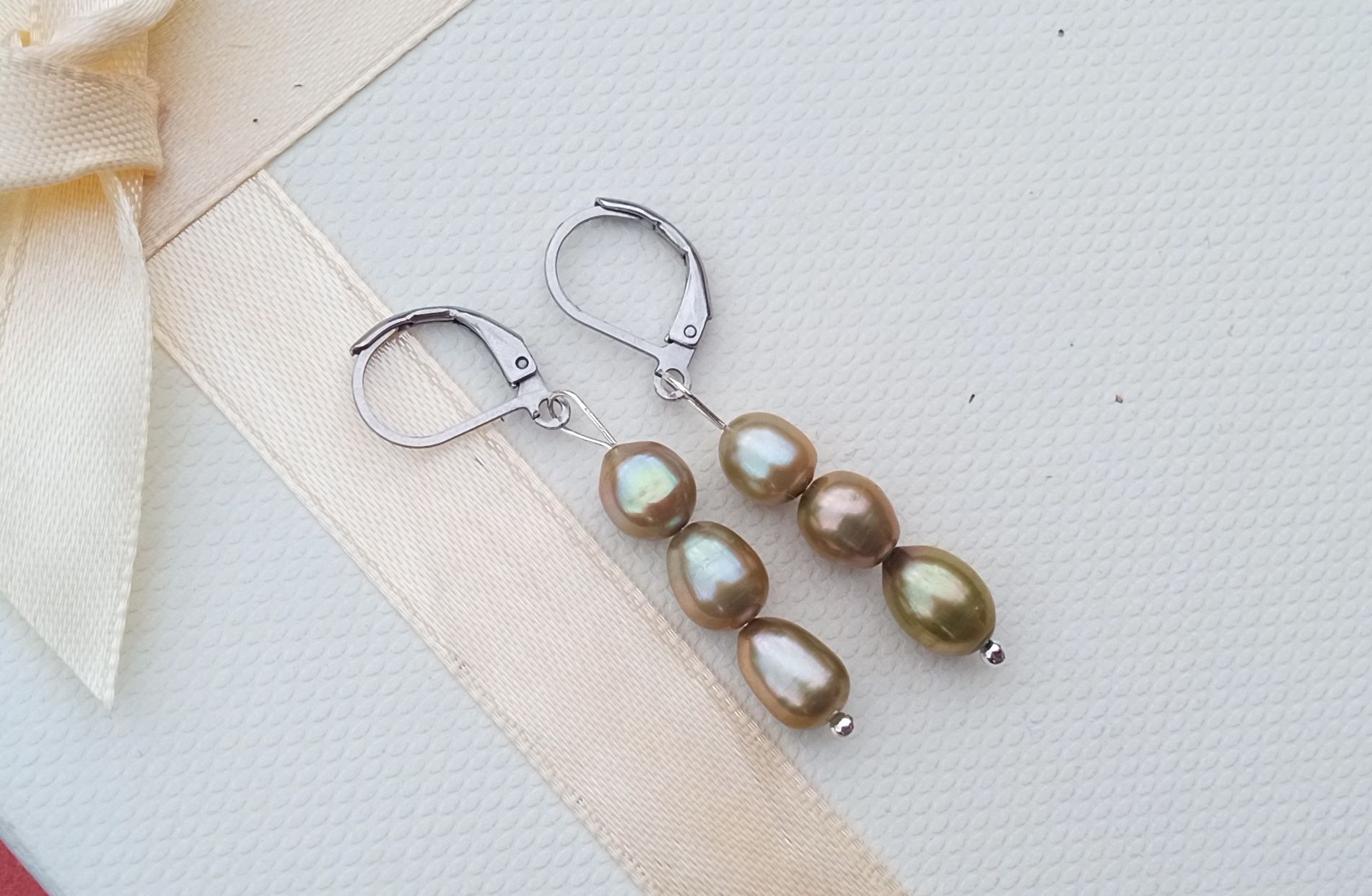 Náušnice vyrobené ze světle zelenkavých dokonale lesklých říčních perliček o velikosti cca 6-9 mm zavěšených na zavíracích háčcích z chirurgické oceli - hypoalergenní, vhodné i pro alergiky. Barva perel je přírodní bez dobarvení!
