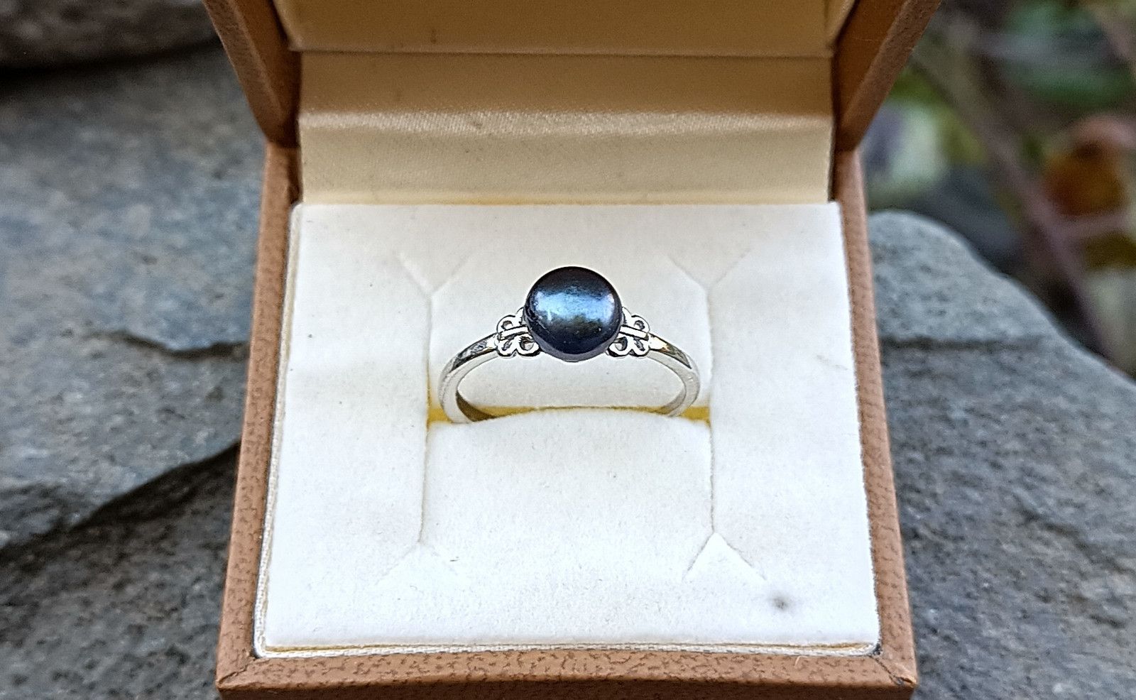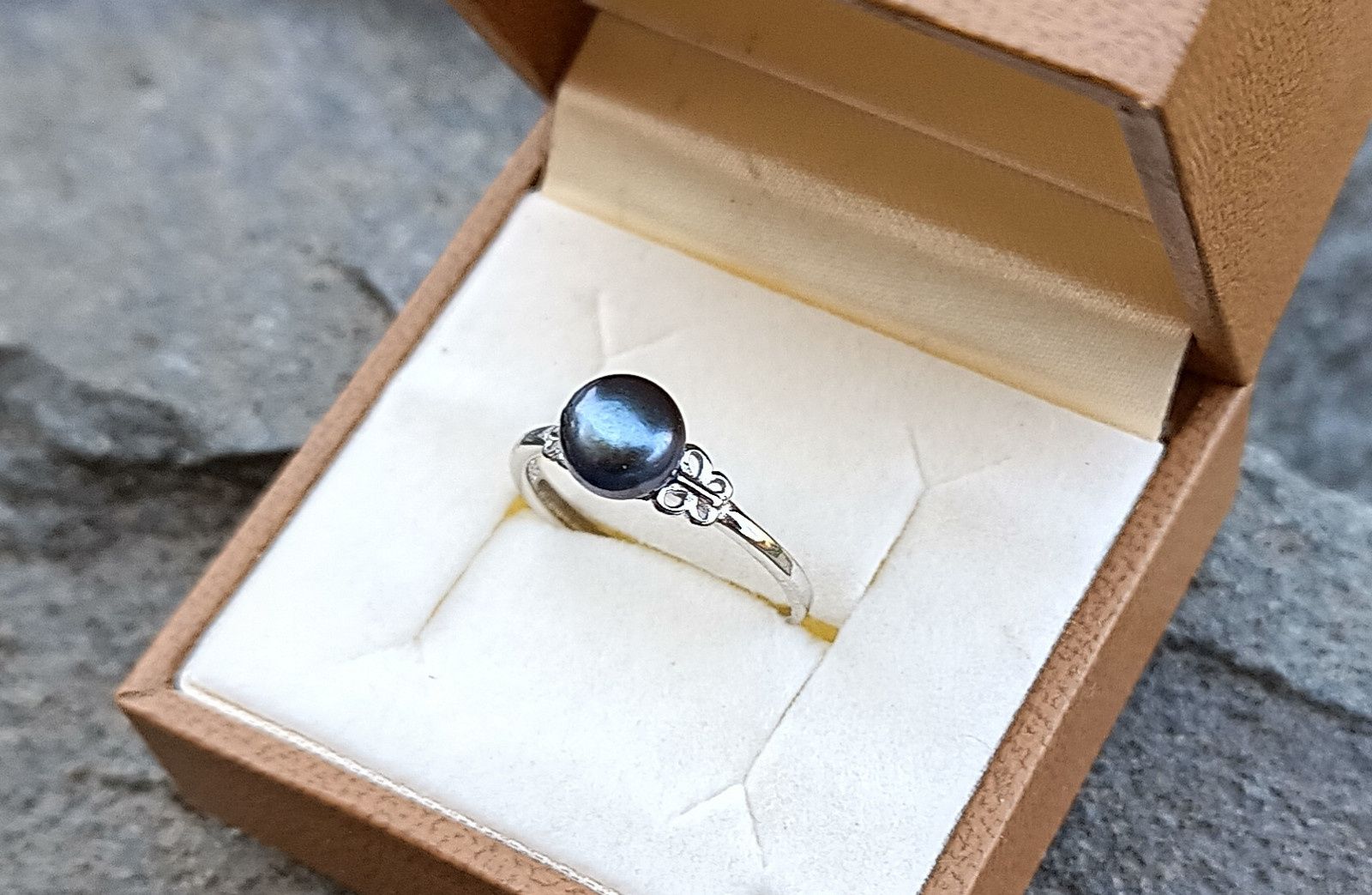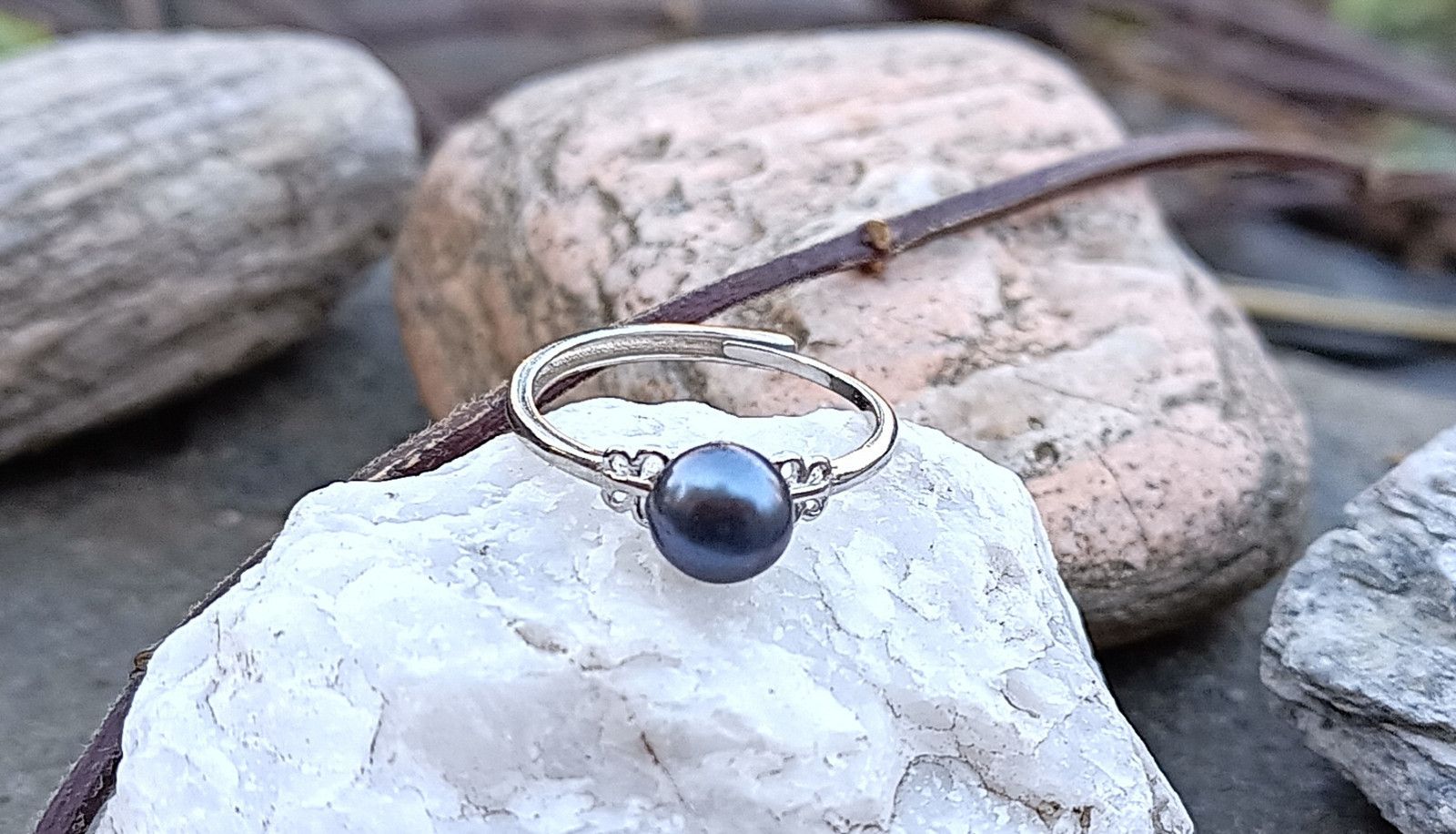 Prstýnek v univerzální velikosti s dokonale lesklou tmavě modrou říční perlou o průměru cca 7 mm v AAA kvalitě zasazenou mezi motýlky do kroužku o síle 2 mm.