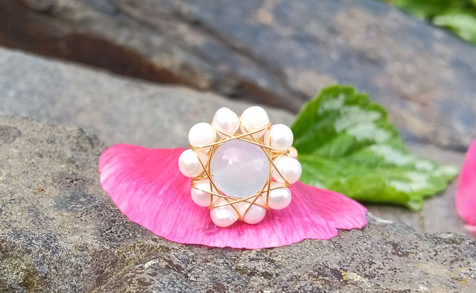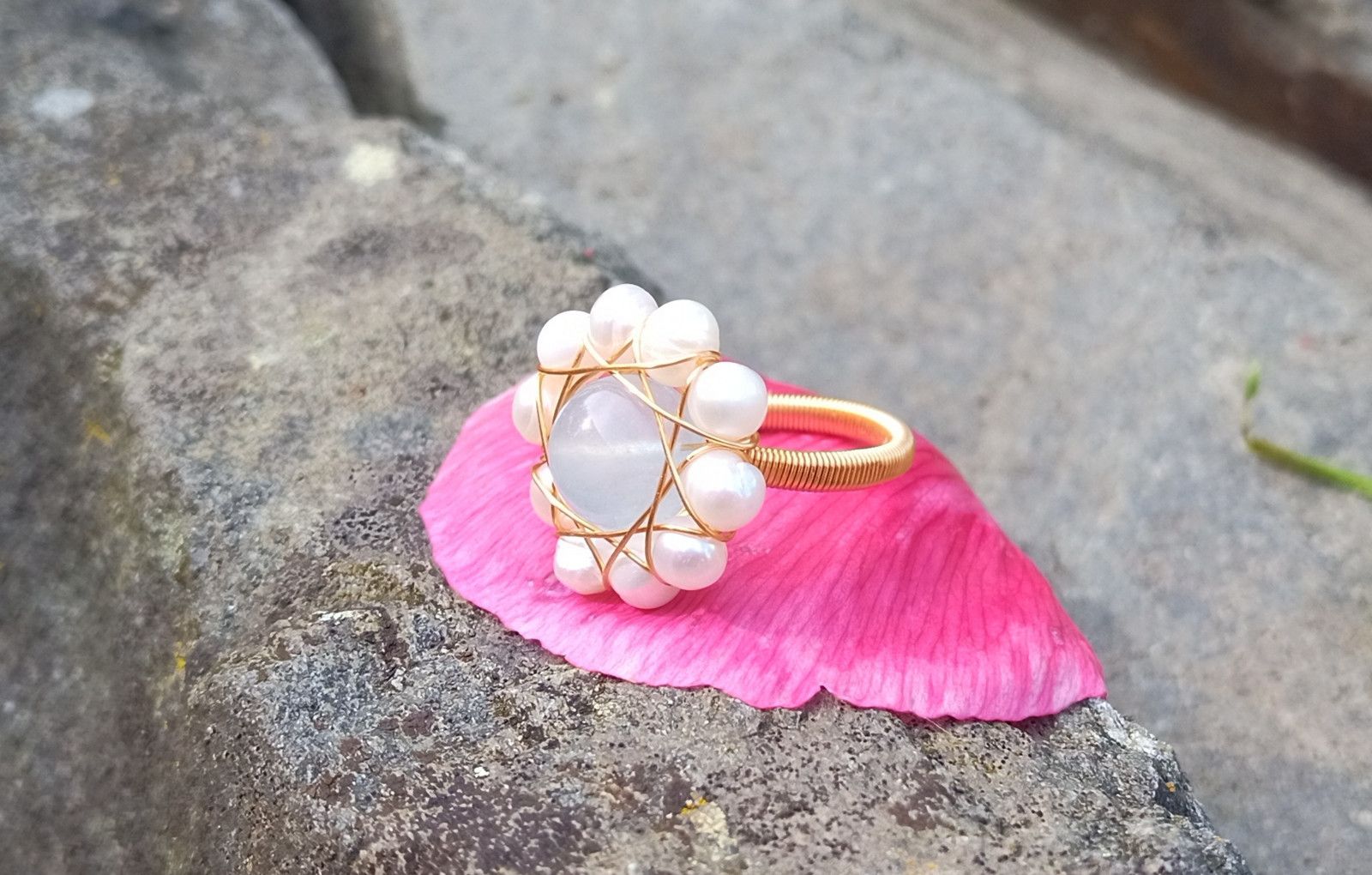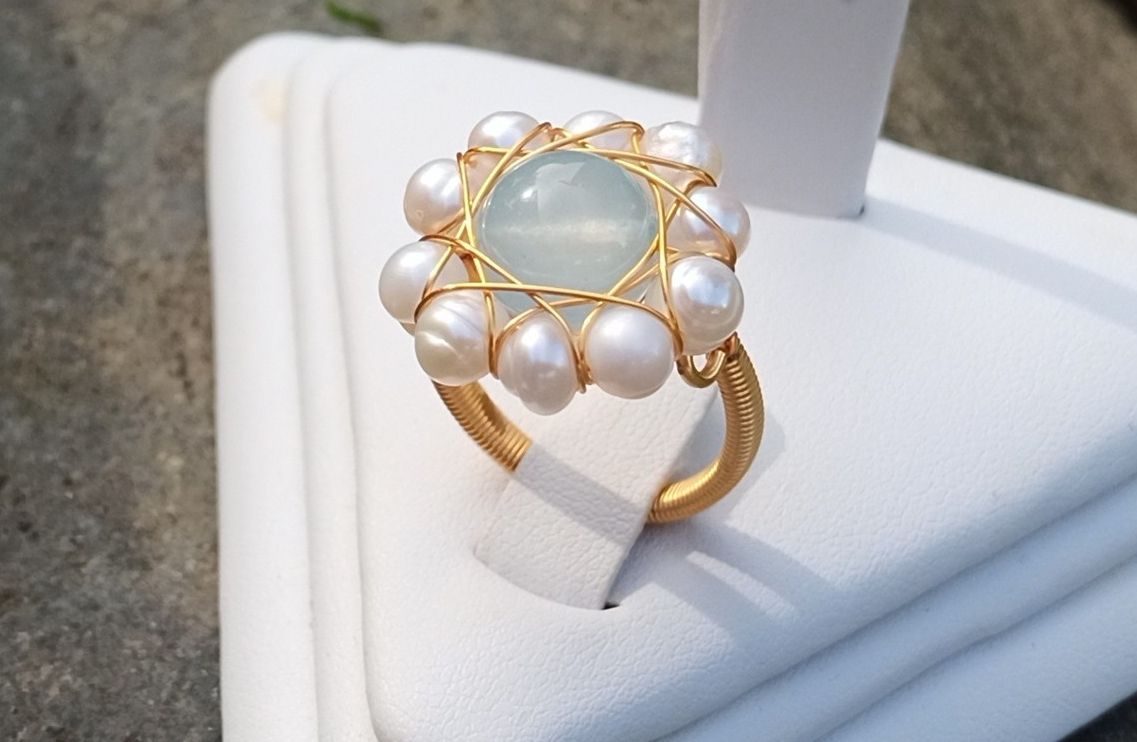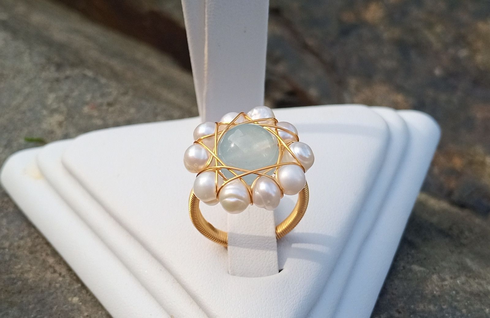 Pozlacený prstýnek ve tvaru květinky vyrobený z malých dokonale lesklých říčních perliček poskládaných okolo šedého achátu. Prstýnek je v univerzální velikosti, kroužek lze upravit podle potřeby přesně na váš prst.