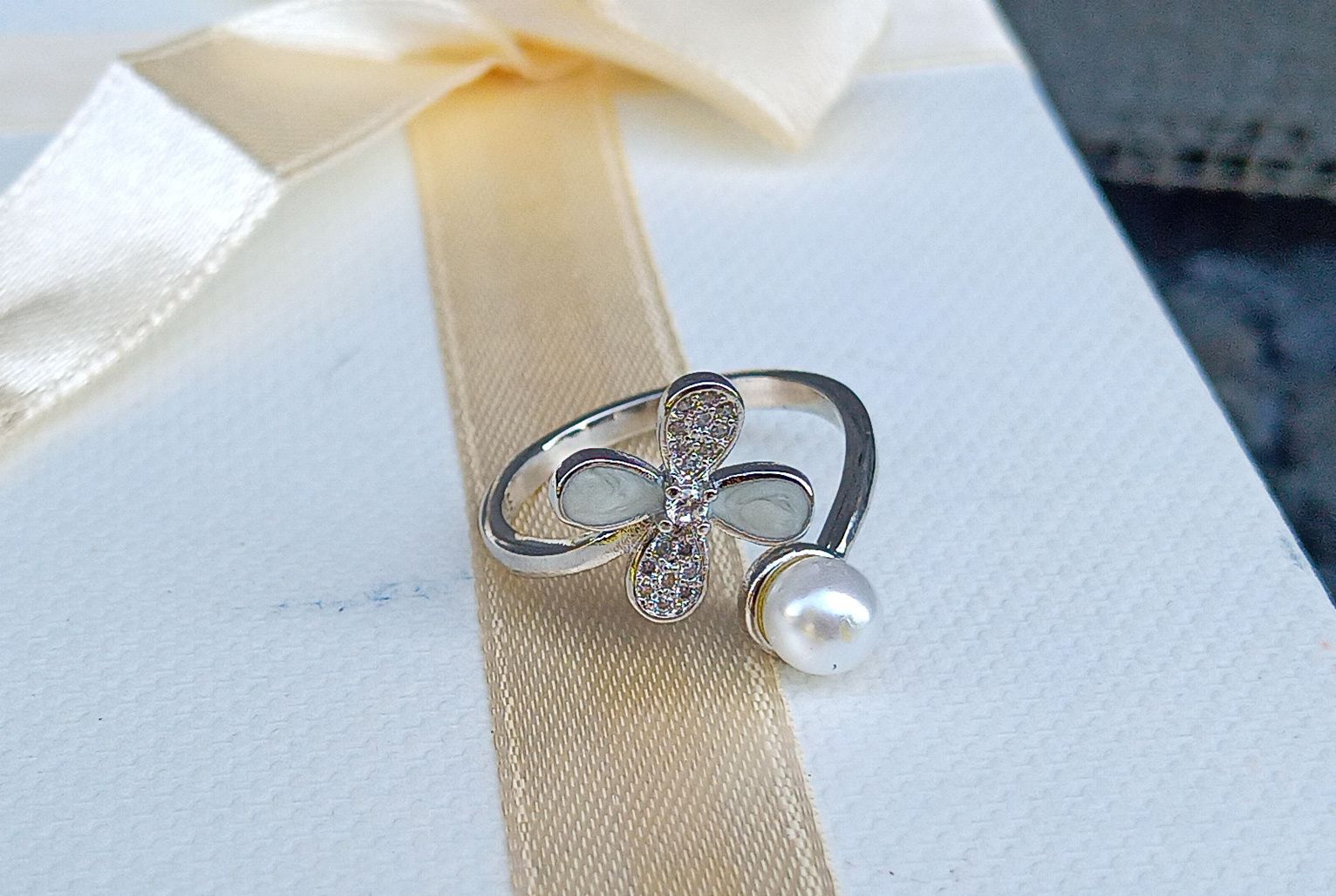 Něžný prstýnek s bílou dokonale leskou shell perličkou o průměru 5 mm zasazenou naproti třpytivé perleťové květince s drobným broušeným kubickým zirkonem uprostřed na ocelovém kroužku o síle 2,5 mm.