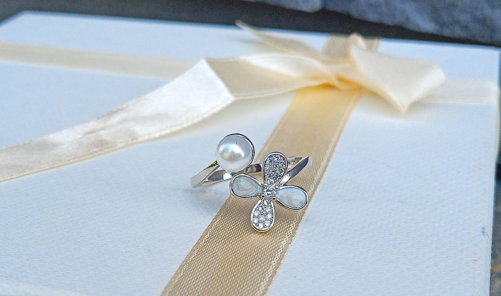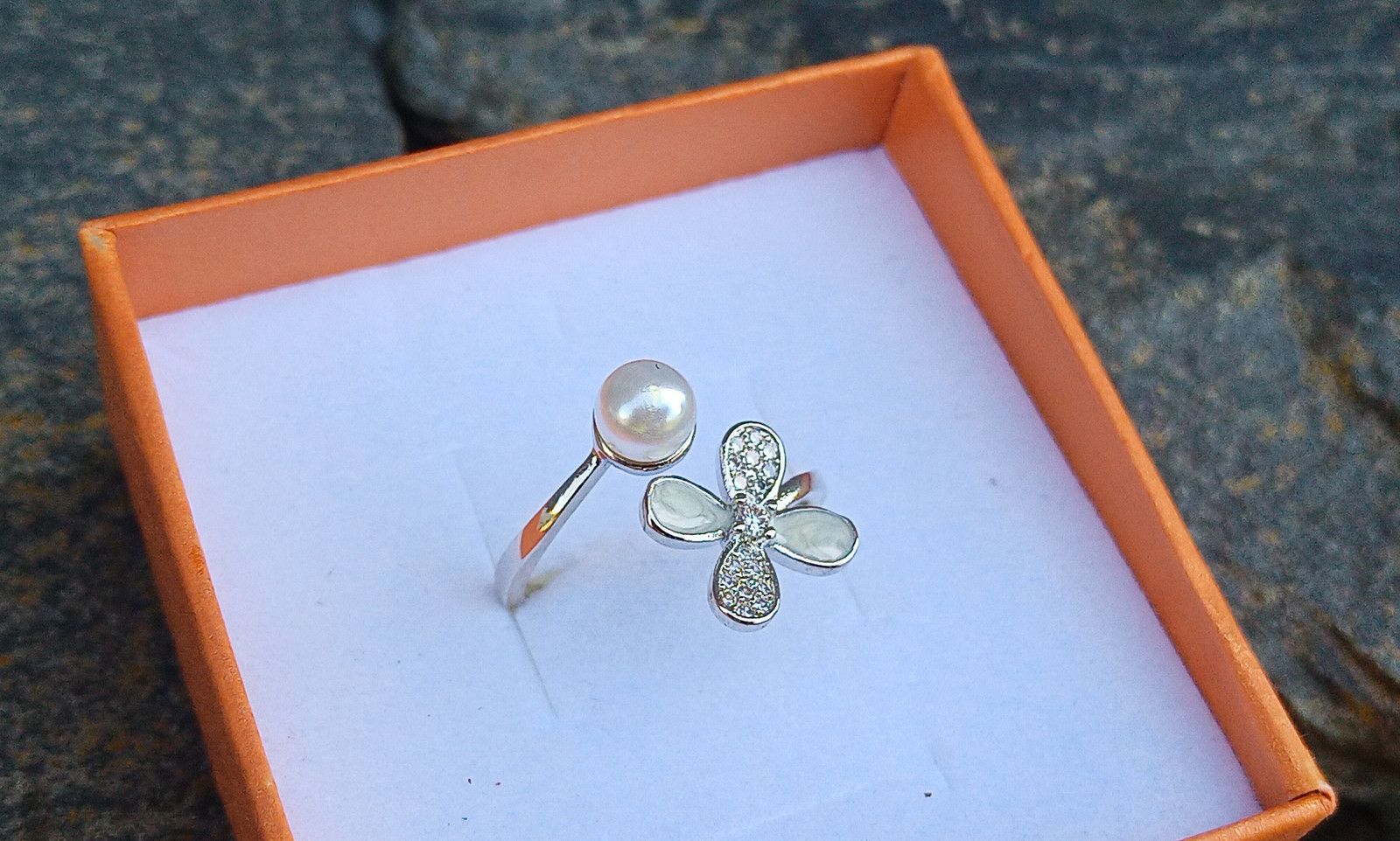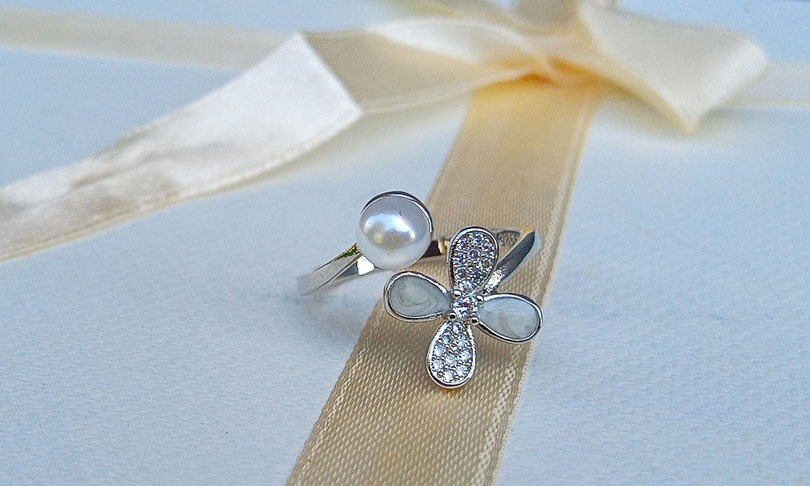 Perlový prstýnek s bílou perlou a zirkony, univerzální velikost