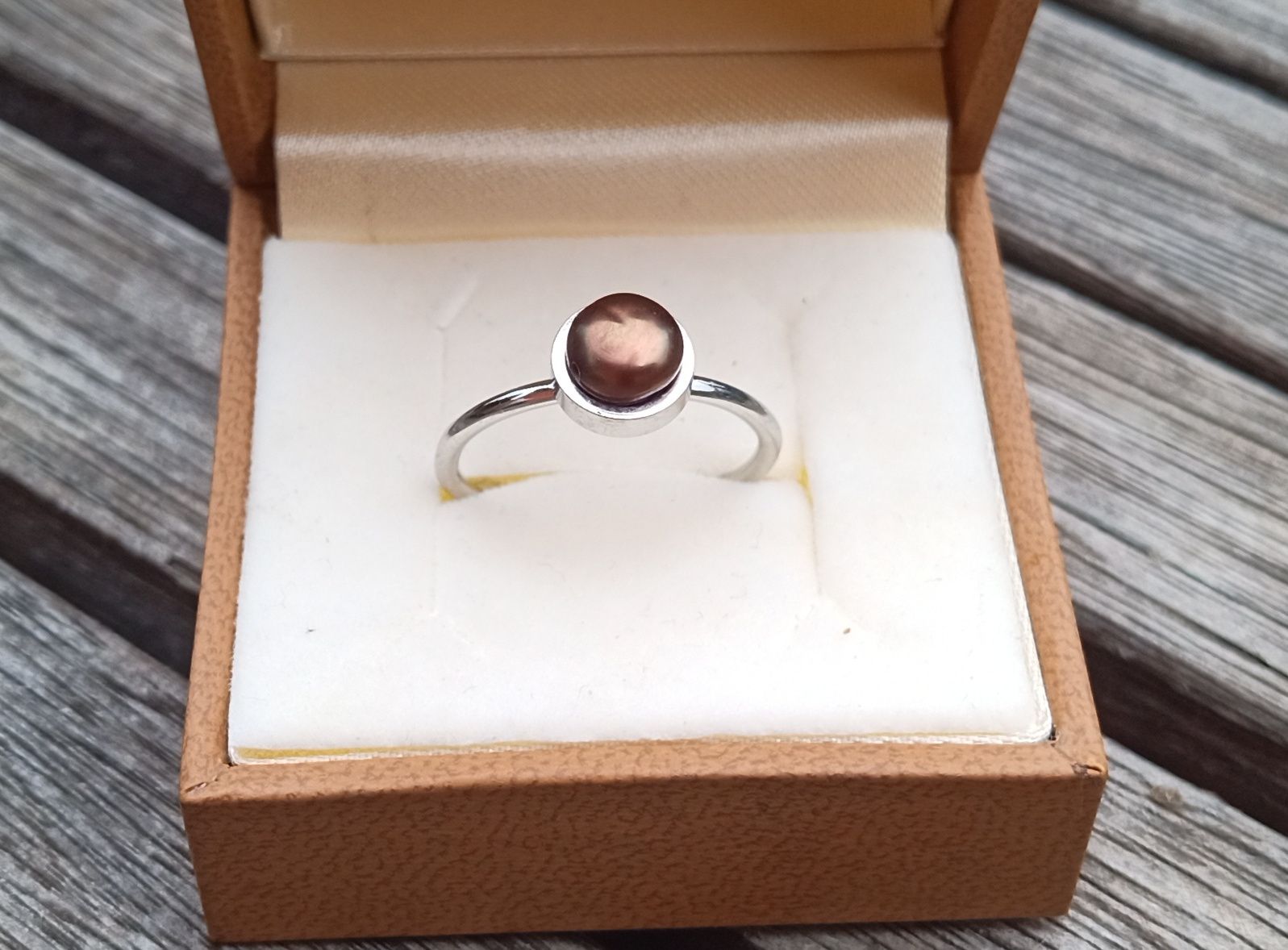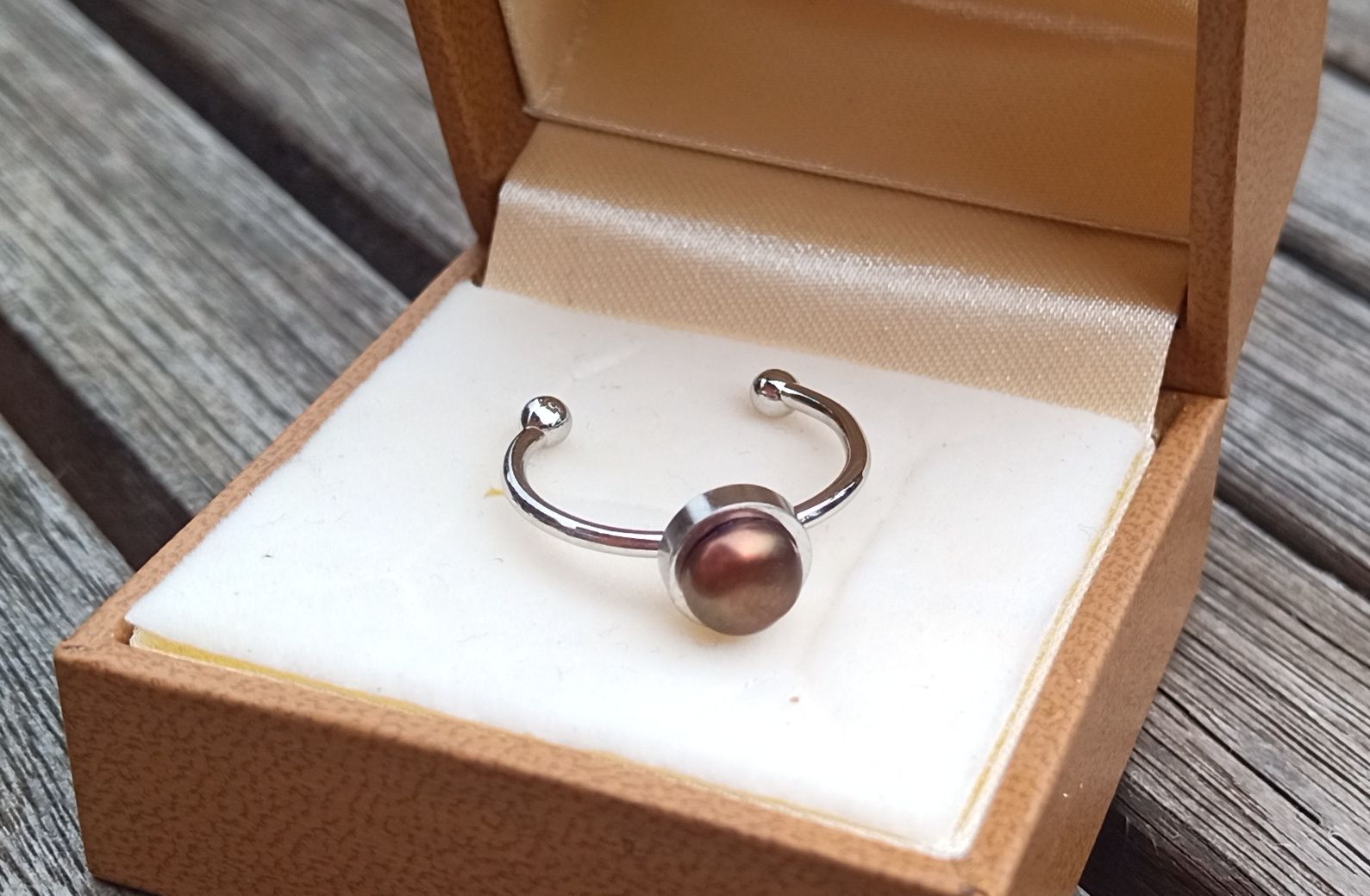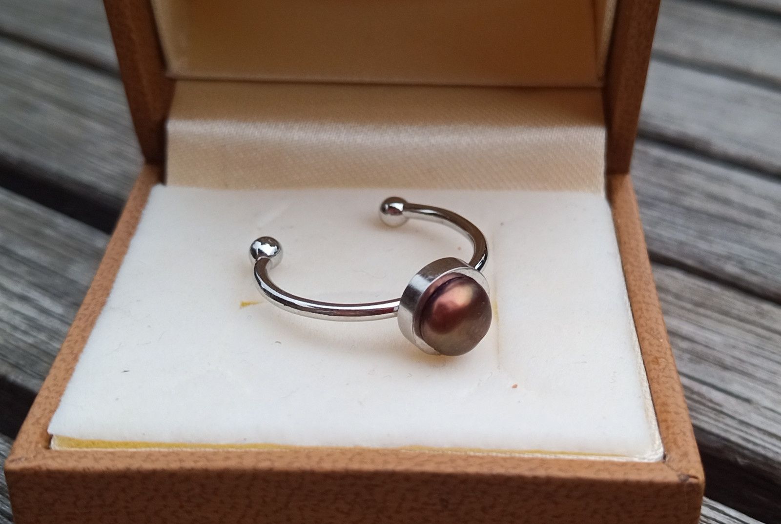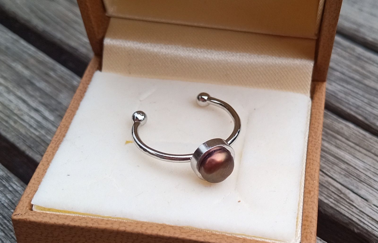 Prstýnek v univerzální velikosti s dokonale lesklou hnědo říční perlou o průměru 5 mm na kroužku z chirurgické oceli - hypoalergenní, vhodný i pro alergiky. Síla kroužku 1,5 mm.
