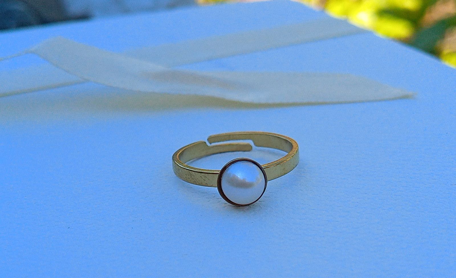Bílá dokonale lesklá říční perla o průměru 6 mm vložená do pozlaceného kroužku z chirurgické oceli o síle 2 mm v univerzální velikosti. Prstýnek je vhodný i pro alergiky. Chirurgická ocel je hypoalergenní kov.