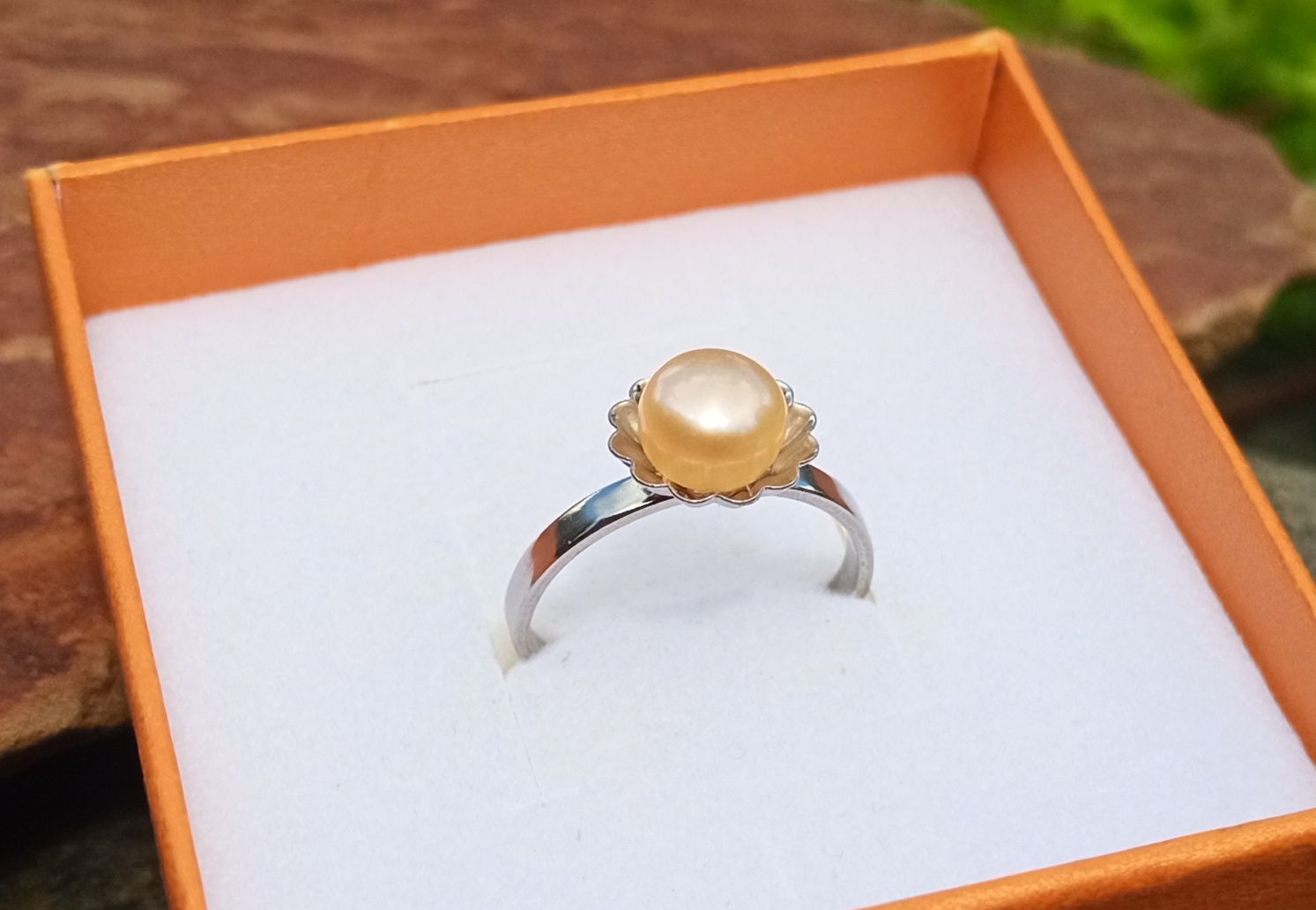 Růžová říční dokonale lesklá perla typu button v AAA kvalitě o průměru 7 mm zasazená do květinky v kroužku v univerzální velikosti z chirurgické oceli - hypoalergenní, vhodný i pro alergiky.