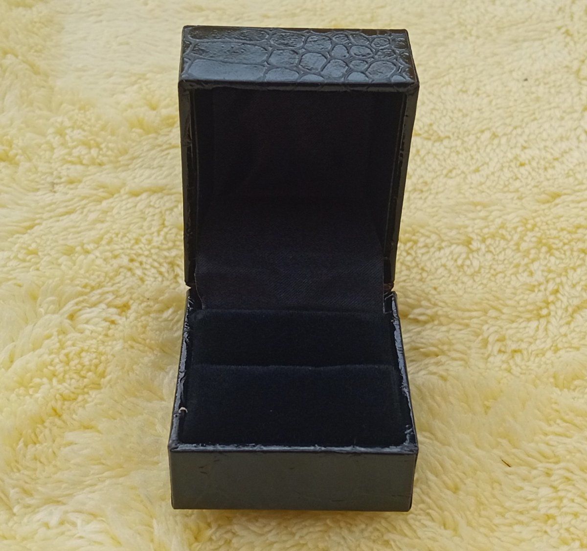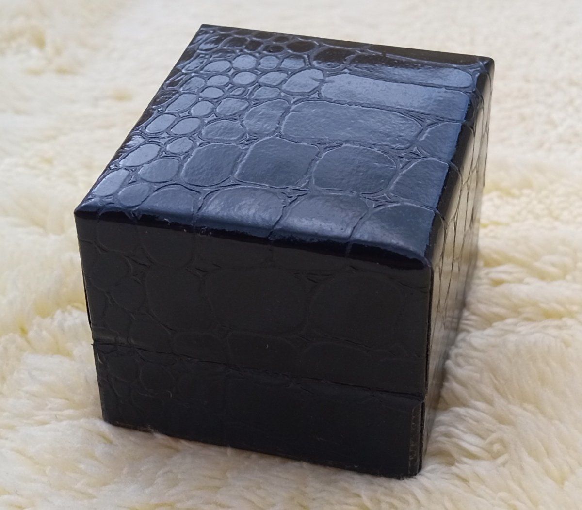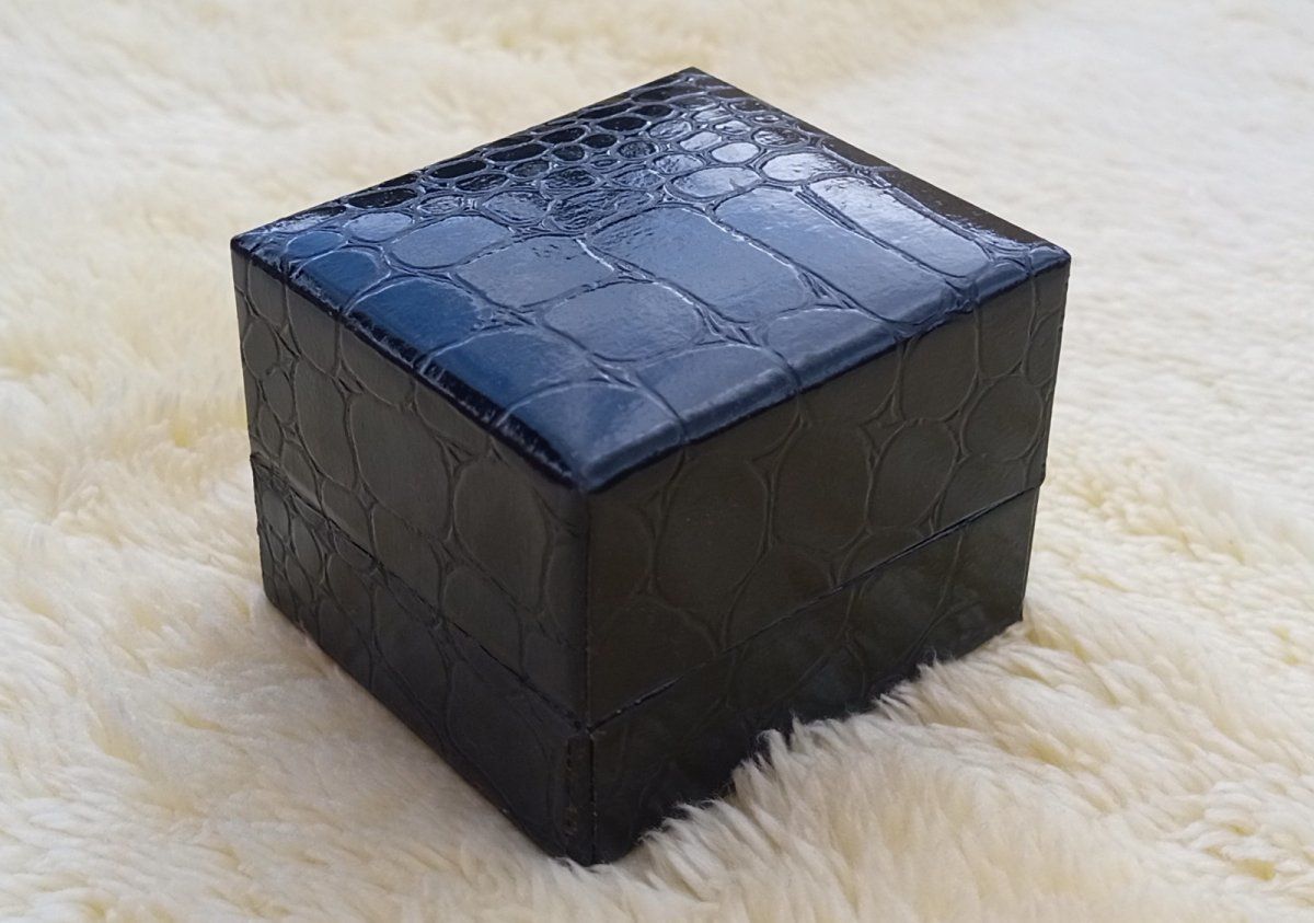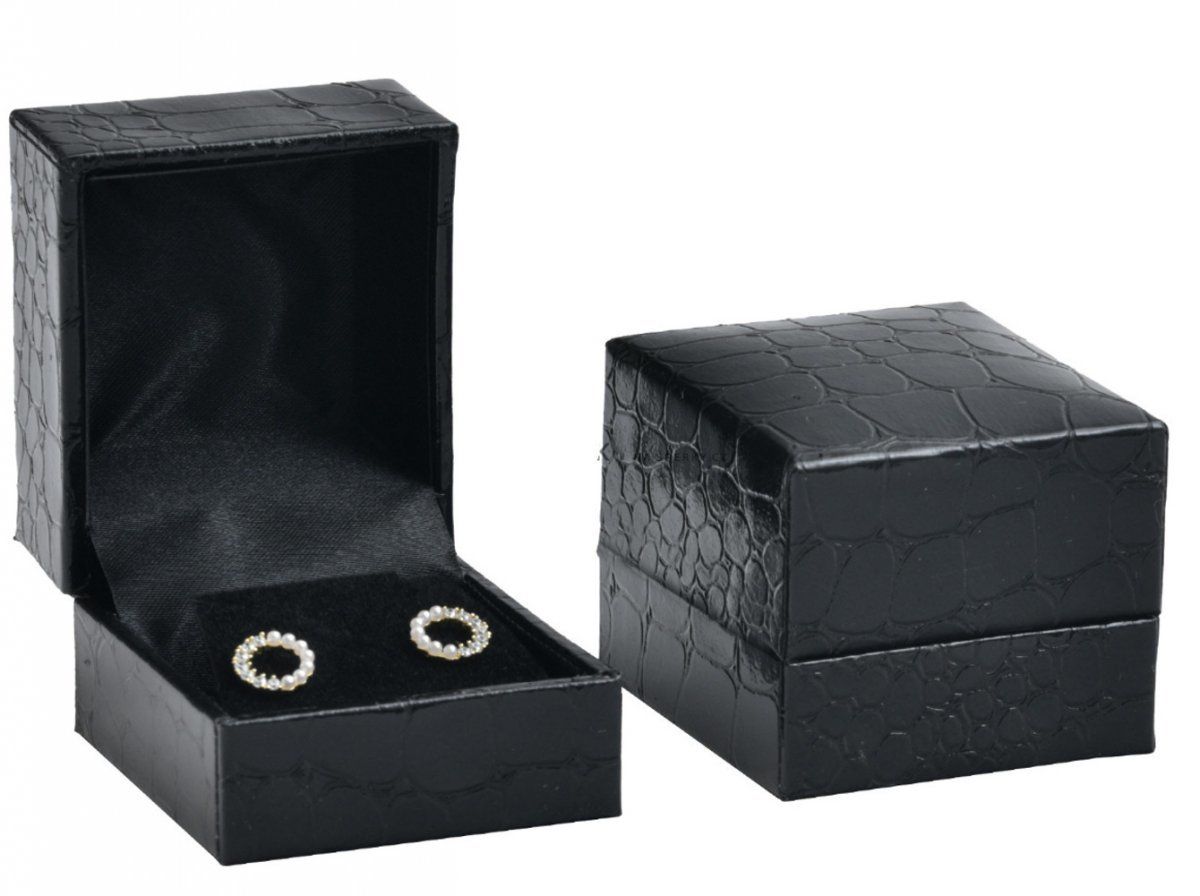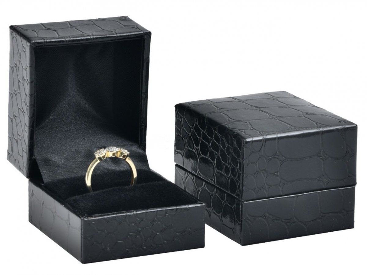 Luxusní černá krabička z eko kůže se vzorem krokodýlí kůže vhodná na prstýnek nebo puzety. Uvnitř krabičky černý samet a satén.
