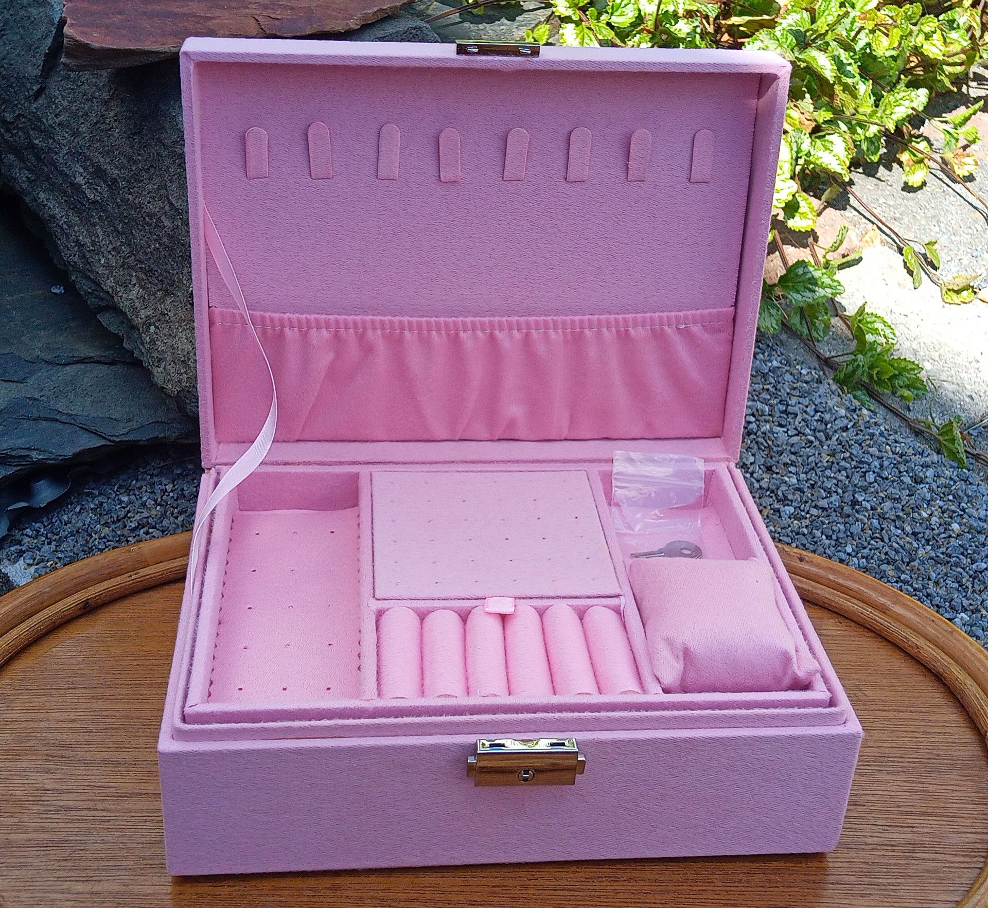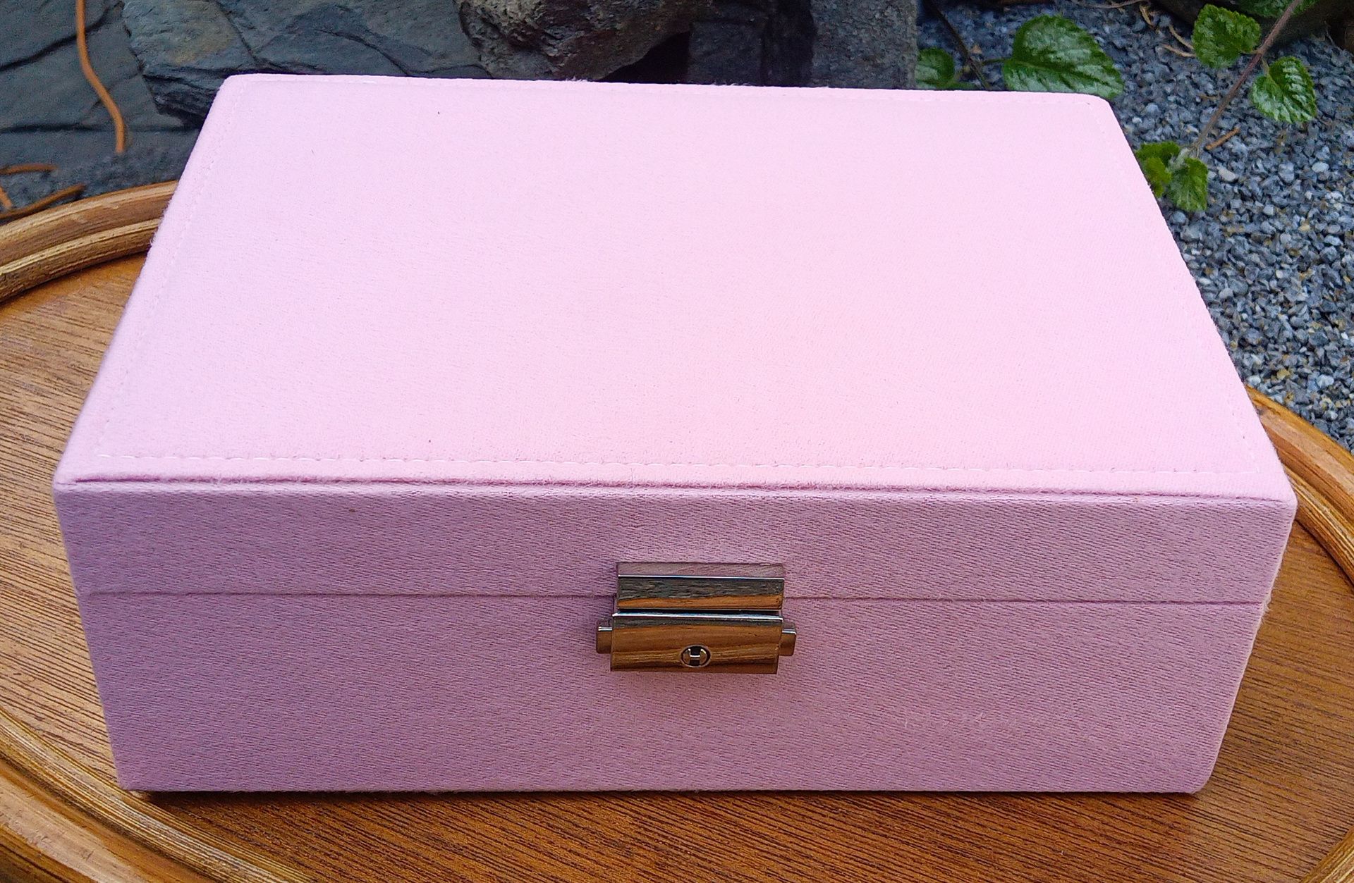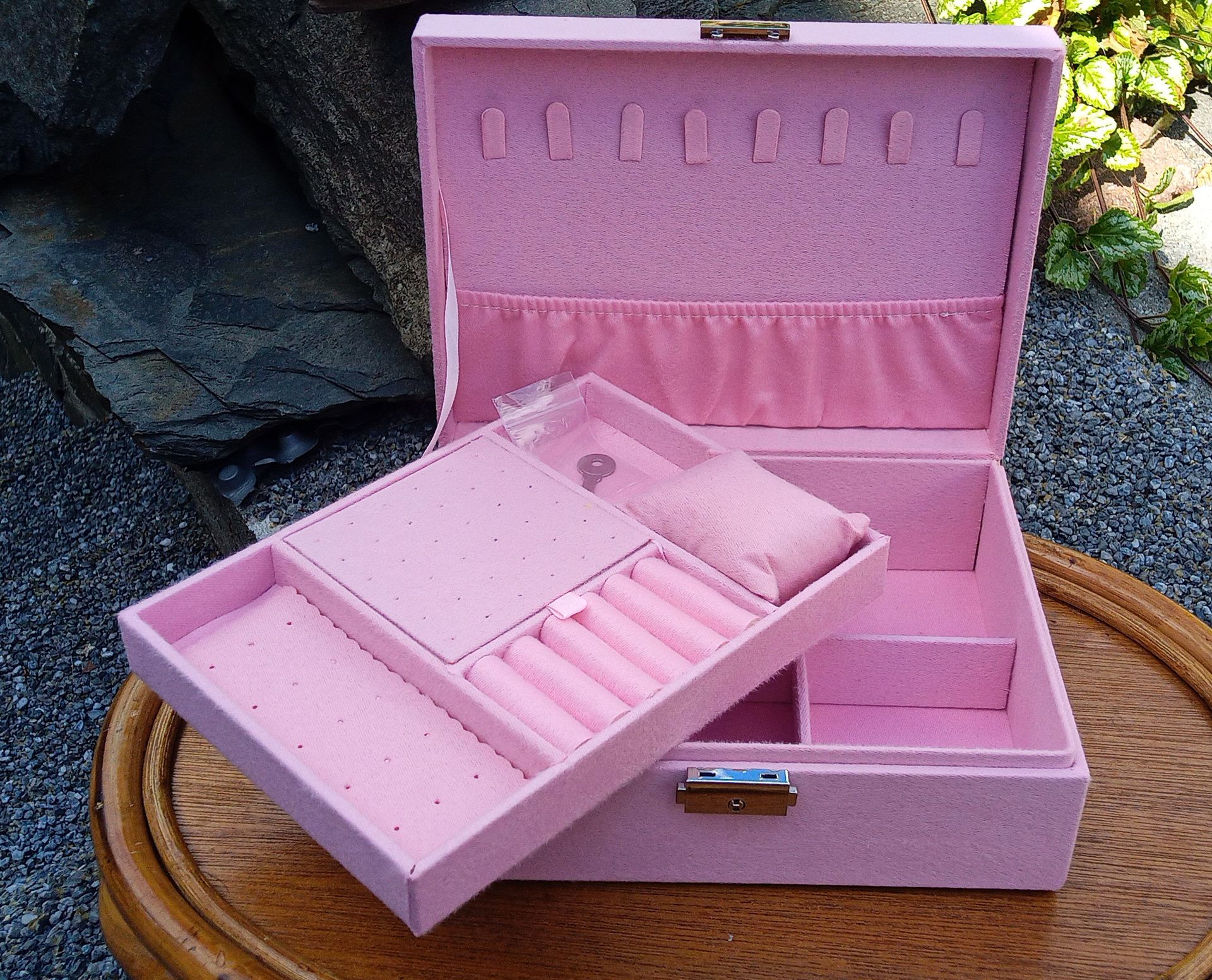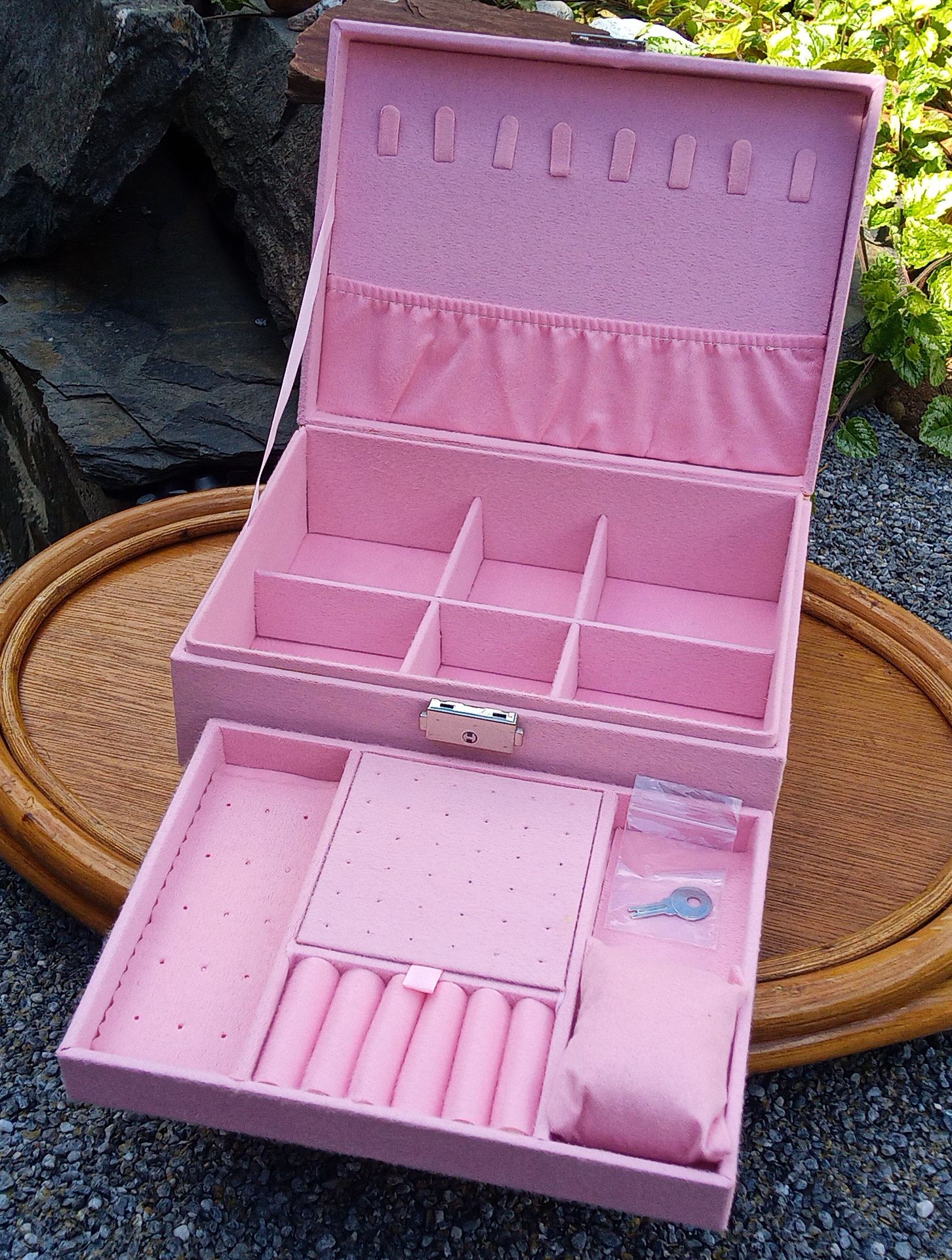 Růžová sametová praktická prostorná šperkovnice se zámkem na klíček o velikosti 23x17x8 cm (šířka x hloubka x výška) se spoustou přihrádek, háčků, kapsičkou, polštářkem na hodinky nebo náramky, s místem na prstýnky, náušnice, řetízky, náhrdelníky atd.. Vejdou se do ní všechny vaše poklady. Vhodná i na cestování. Šperkovnice je dvoupatrová. Vaše šperky v ní budou v bezpečí a přehledně uspořádané.