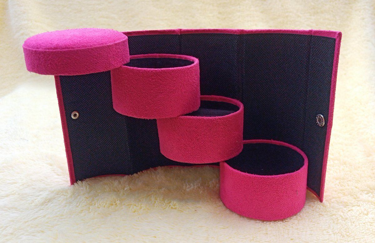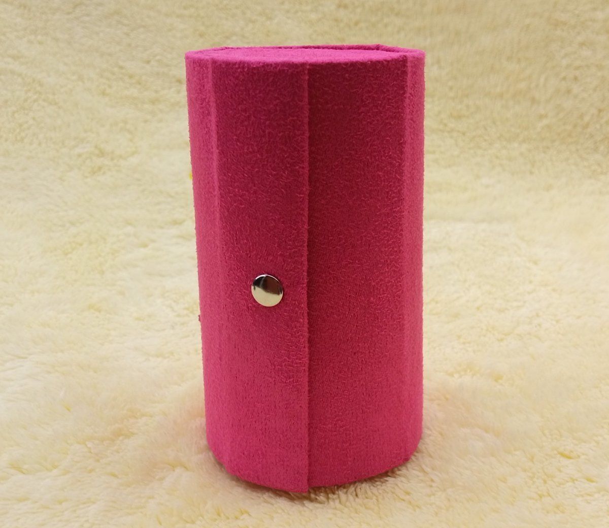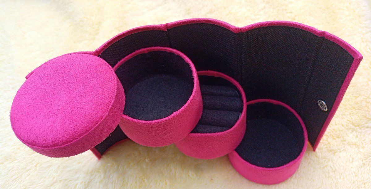 Sametová třípatrová šperkovnice ve tvaru válce, vhodná i jako šperkovnice na cesty. Zapínání obalu je patentním knoflíkem. Obal šperkovnice po otevření slouží jako střední sloupek. Uvnitř šperkovnice jsou sloty na prsteny nebo náušnice.